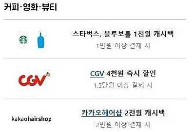 카카오뱅크 체크카드 이번 프로모션 혜택들 입니다. 편의점, 배달, 커피, 영화, 뷰티, 학원, 어학시험 등에 대해 캐시백 혜택이 진행중이니 확인하시고 이용하시길 바랍니다.