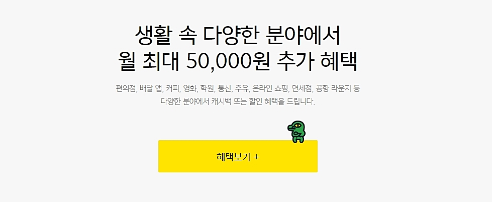 카카오뱅크 체크카드 혜택으로는 생활 속 다양한 분야에서 월 최대 5만원 추가 혜택이 있습니다. 편의점, 배달앱, 커피, 영화, 학원, 통신, 주유, 온라인 쇼핑, 면세점, 공항 라운지 등 다양한 분야에서 캐시백 또는 할인 혜택을 드립니다.